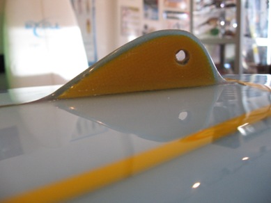 LIGHT BLUE TINT WITH CUTLAPS AND DECK PATCH YELLOW PINLINE. CUSTOM FIN, LEASH LOOP AND TAIL BLOCK MADE FROM SAME FIN PANEL.