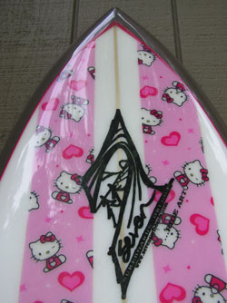 CHOCOLATE OPAQUE BOTTOM, INLAID HELLO KITTY FABRIC ON DECK WITH PINK PINLINE