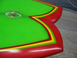RED OPAQUE BOTTOM WITH GREEN TINT DECK AND TRIPLE PINLINE IN RED, GOLD AND GREEN