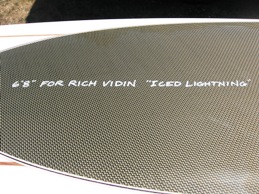 BLUE ACID WASH BOTTOM. CLEAR DECK WITH YELLOW CARBON/KEVLAR INLAY IN CONCAVE. TRIPLE PINLINES IN CHAMPAGNE AND PURPLE