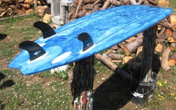 6’8” MAGIC BULLET MODEL. TRIPLE SOFT WING SWALLOW TAIL FISH HYBRID. SINGLE TO DOUBLE CONCAVE WITHIN SLIGHT VEE. CONCAVE DECK. DOUBLE 3/16” CEDAR STRINGERS AT 6” OFFSET. BLUE GLUE CENTERLINE