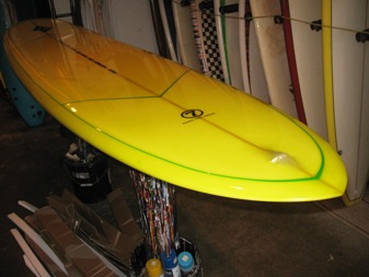 9’4” MODERN SINGLE FIN. ROUND PIN TAIL. NOSE CONCAVE, SLIGHT VEE TAIL.