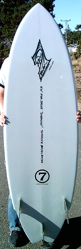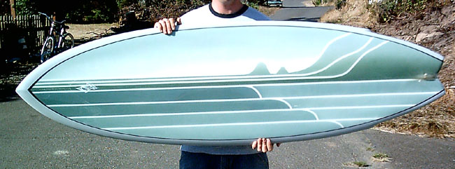 GREY OPAQUE BOTTOM WITH FOGGY NORTH COAST AIRBRUSHED MURAL ON DECK.  BLACK PINLINES AND FINS