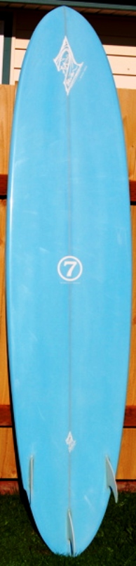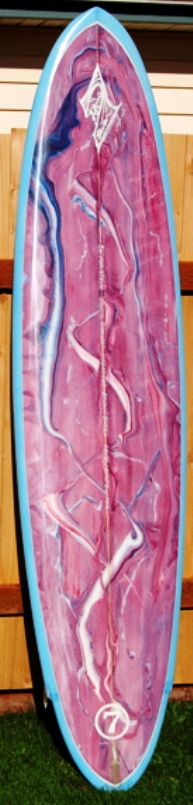 LIGHT BLUE BOTTOM WITH ACID SPLASH FOAM STAIN ON DECK. WHITE PINLINE