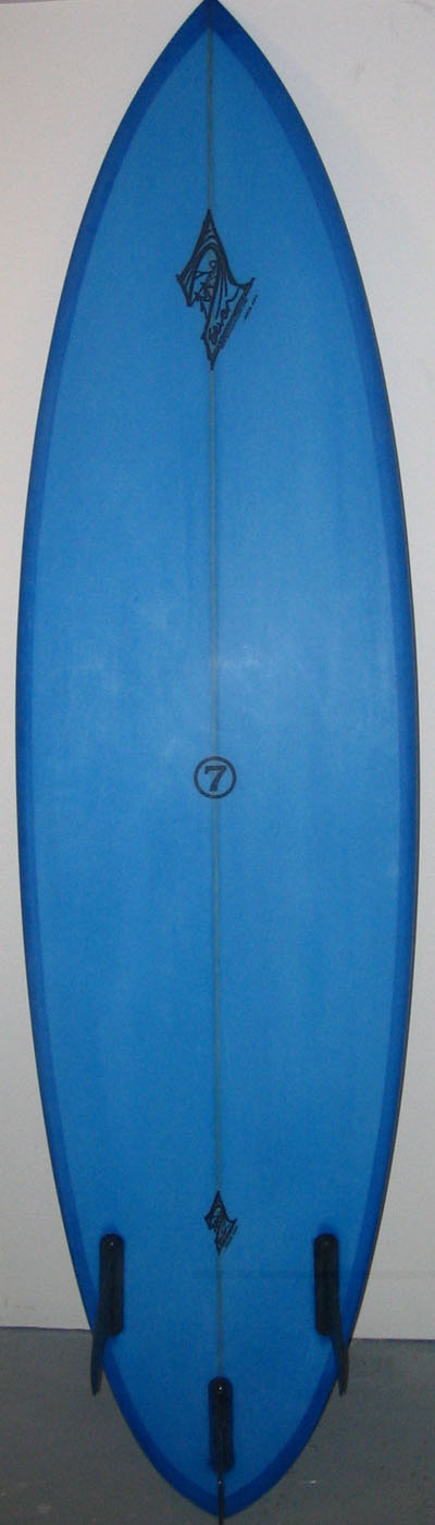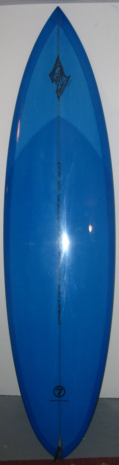 6'10" big wave round pintail shortboard, single to double concave within a vee, chopbreaker nose. "Ice Machine" ice blue tint with cut laps and 6oz deck patch future tri fin boxes