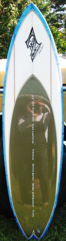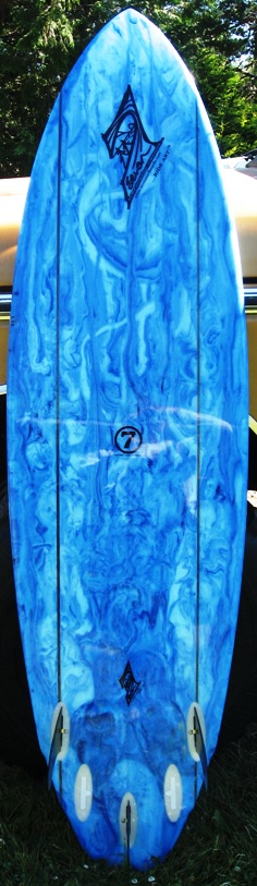 6’8” MAGIC BULLET MODEL. TRIPLE SOFT WING SWALLOW TAIL FISH HYBRID. SINGLE TO DOUBLE CONCAVE WITHIN SLIGHT VEE. CONCAVE DECK. DOUBLE 3/16” CEDAR STRINGERS AT 6” OFFSET. BLUE GLUE CENTERLINE