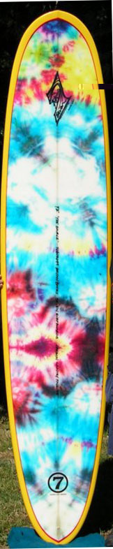 CUSTOM TIE DYE CLOTH INLAID DECK WITH YELLOW OPAQUE BOTTOM AND RED PINLINE